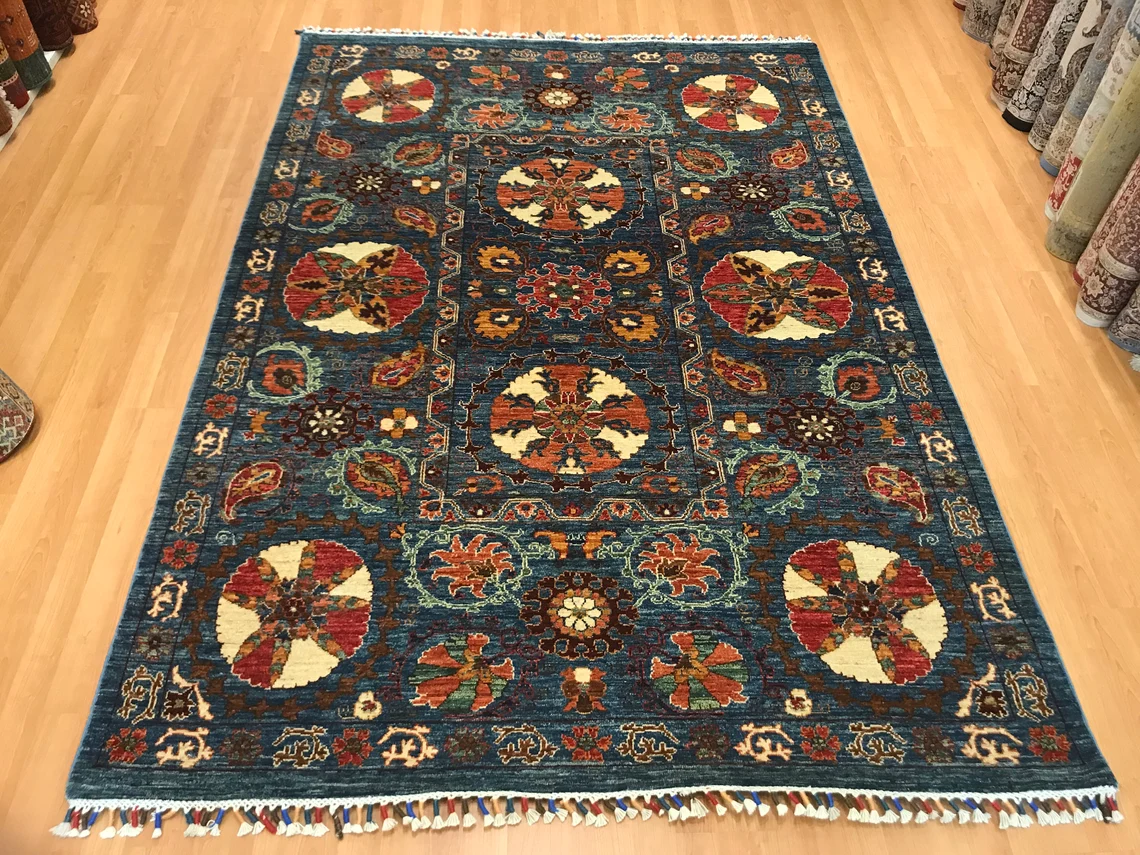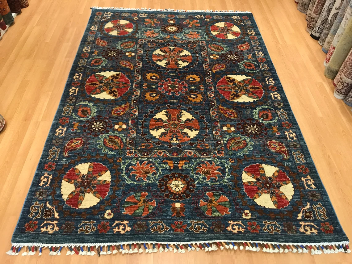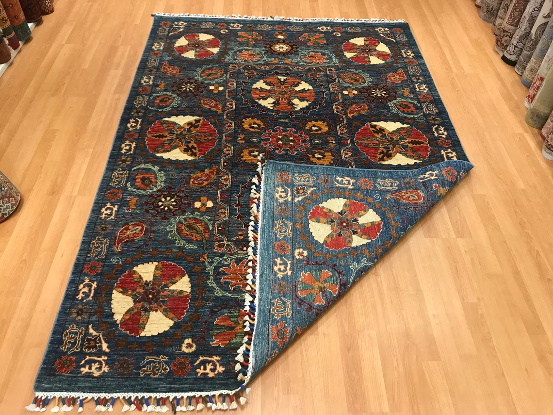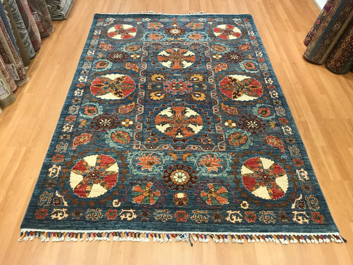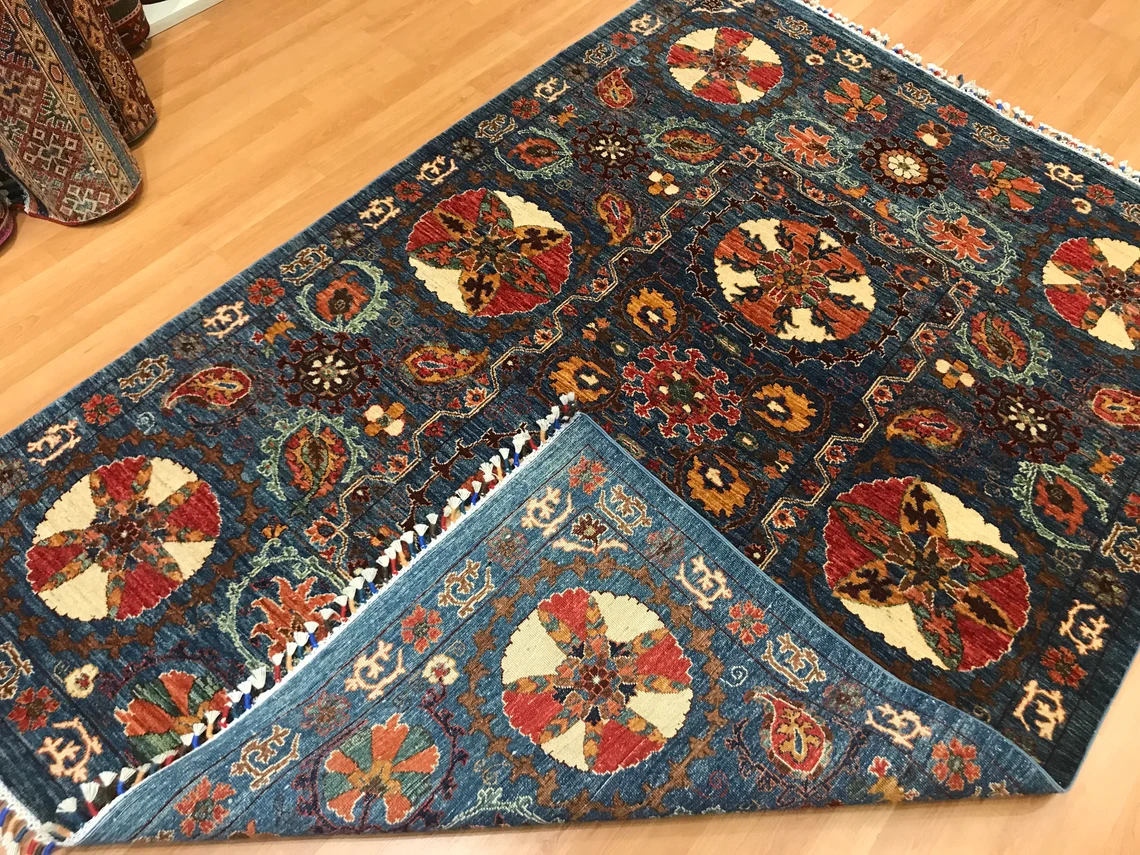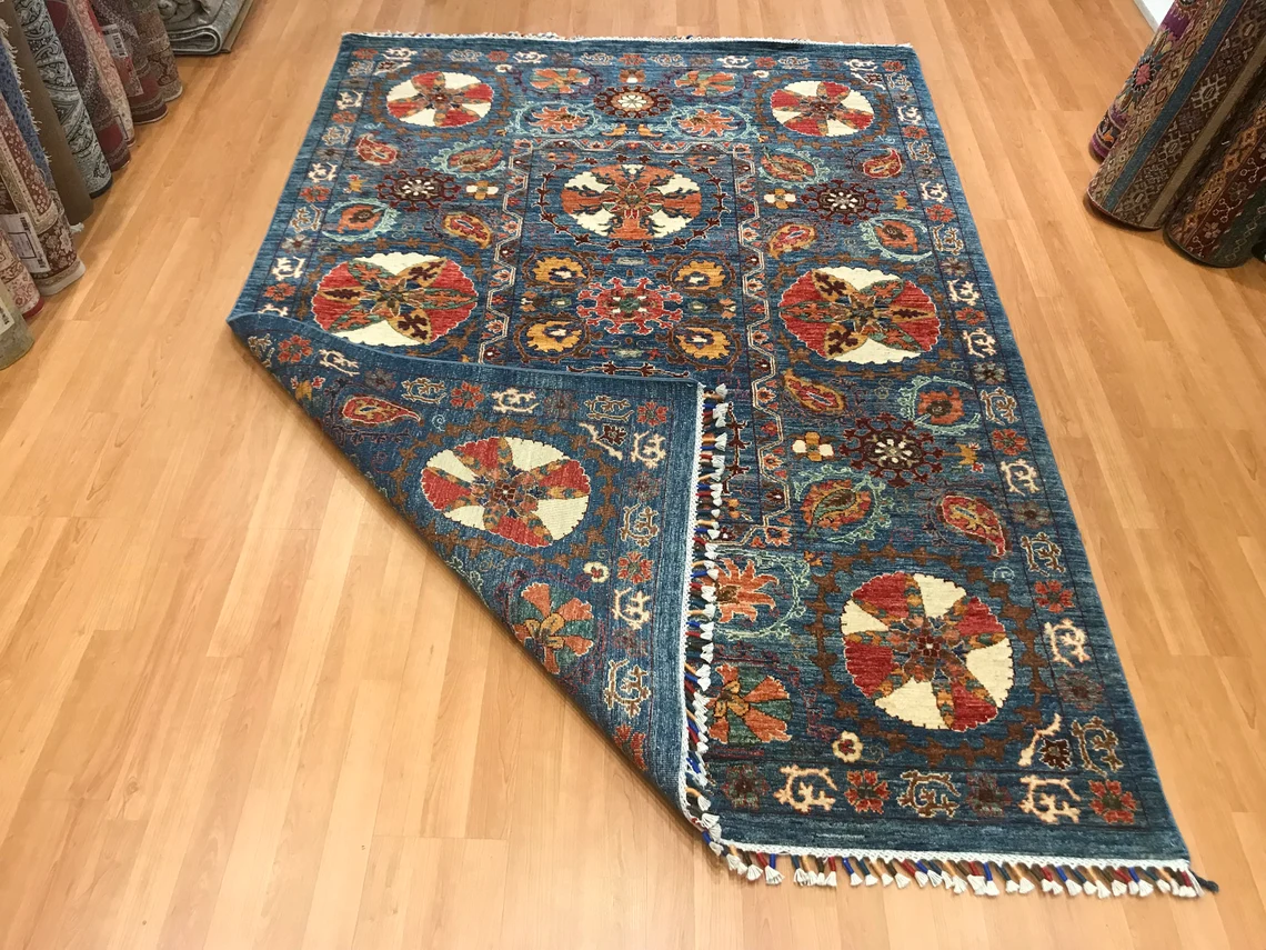 Our beatiful handmade carpet is made by wool on cotton. It is 7'8'' by 5'4'' ( 235 cm x 165 cm ) . It is double-knott and 20 years old . It is usable with shoes .It is professionally cleaned, washed and ready to use.