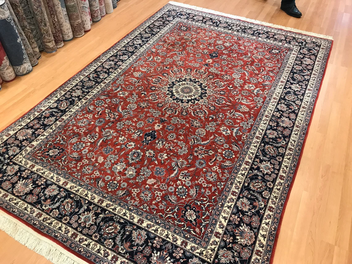 It is made by wool on cotton and 9'2'' by 6'2 '' ( 280 cm x 188 cm ) , 40 years old . It suits every part of your house.