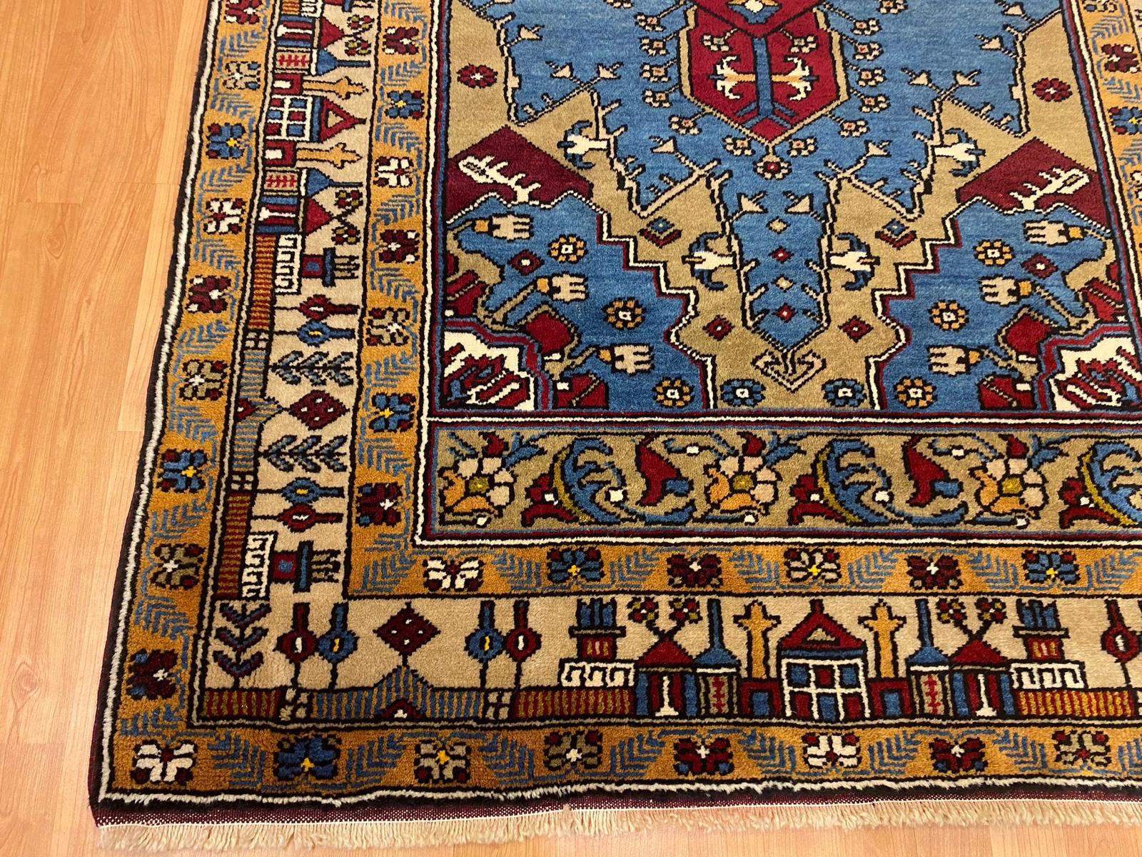 This beautiful kilim is 20 years old and 3.1 ft by 2.7 ft ( 118 x 0.80 cm ). It is made by wool on wool . It is already cleaned and ready to use.