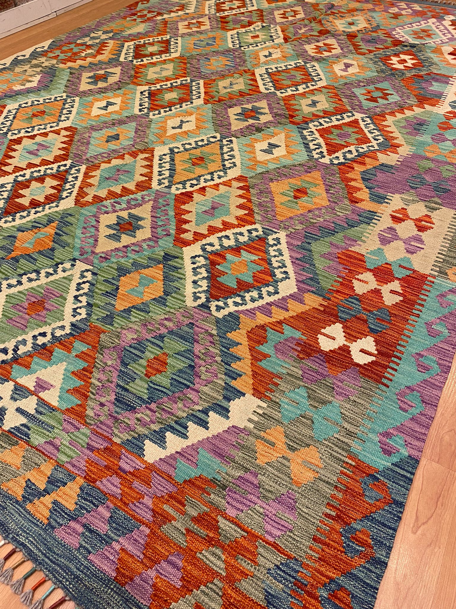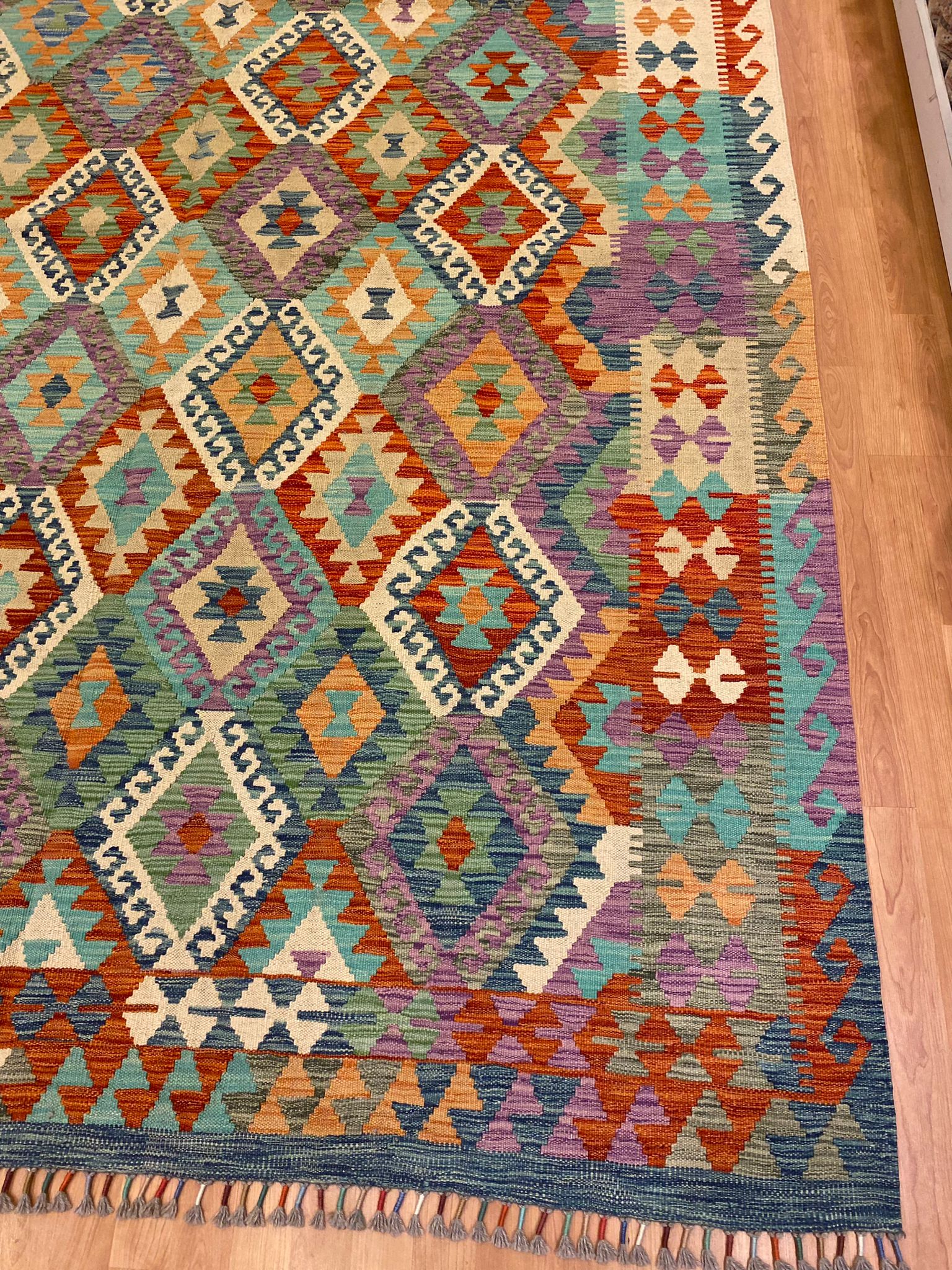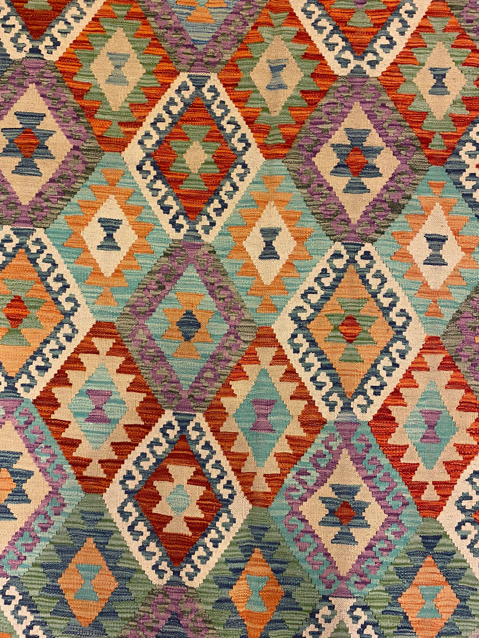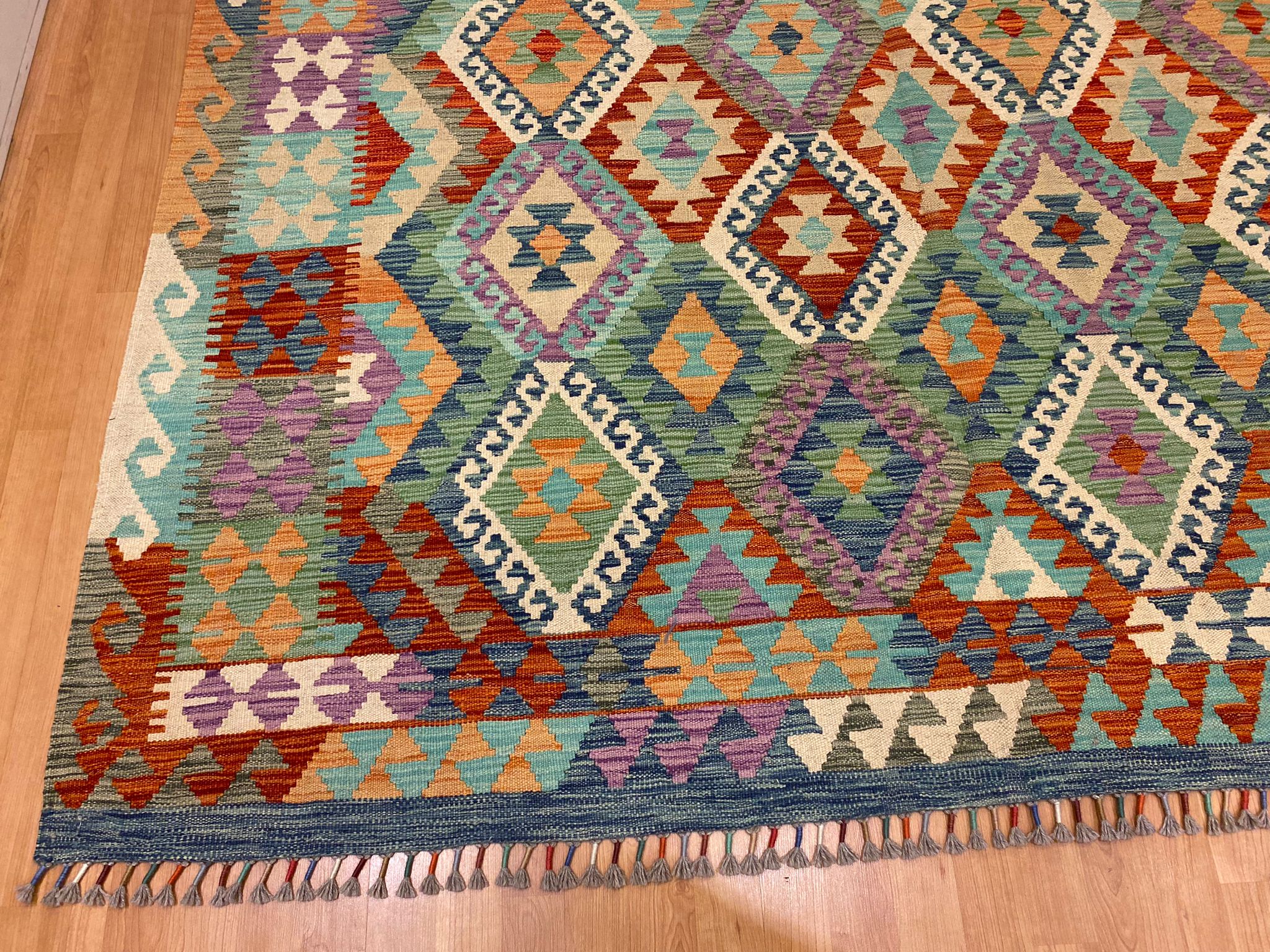 This beautiful kilim is 20 years old and 3.1 ft by 2.7 ft ( 118 x 0.80 cm ). It is made by wool on wool . It is already cleaned and ready to use.