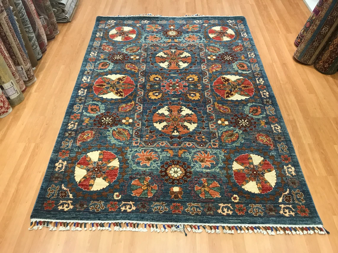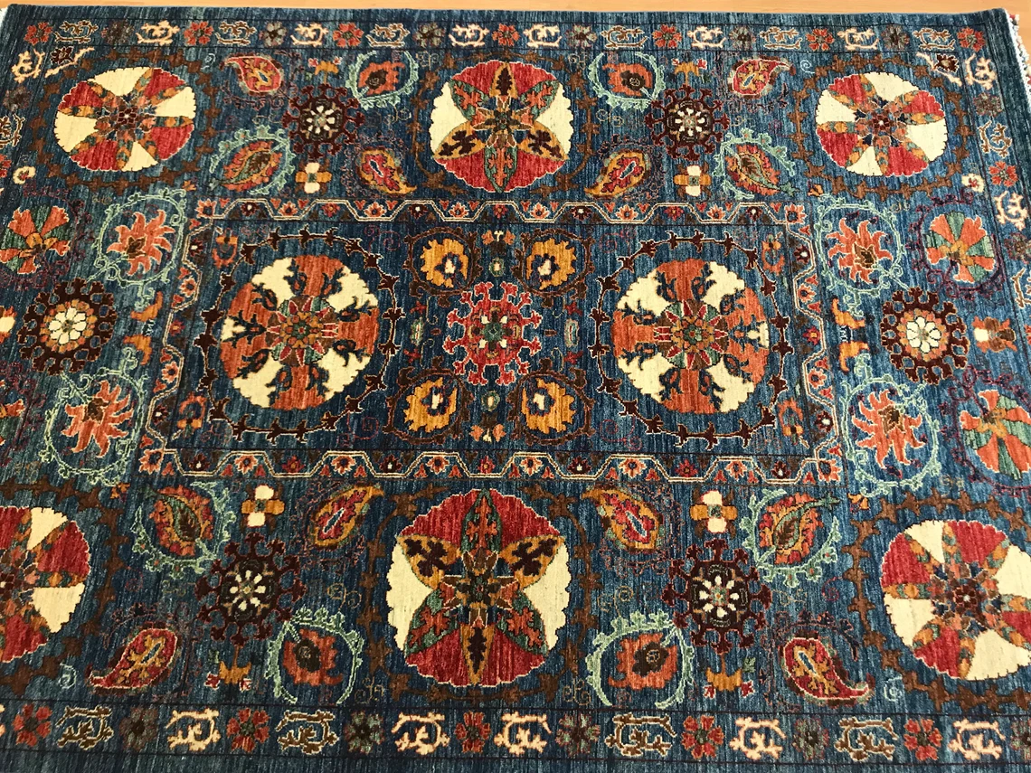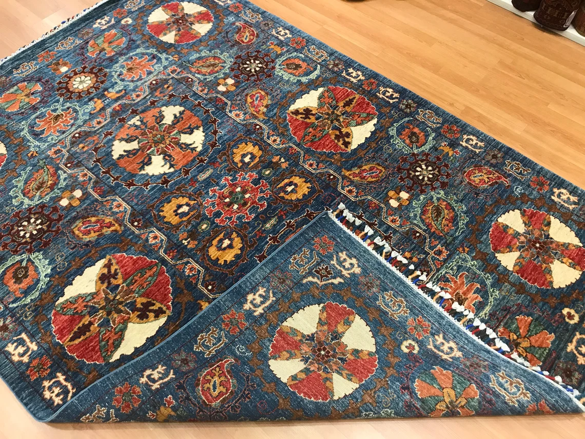 Our beatiful handmade carpet is made by wool on cotton. It is 7'8'' by 5'4'' ( 235 cm x 165 cm ) . It is double-knott and 20 years old . It is usable with shoes .It is professionally cleaned, washed and ready to use.