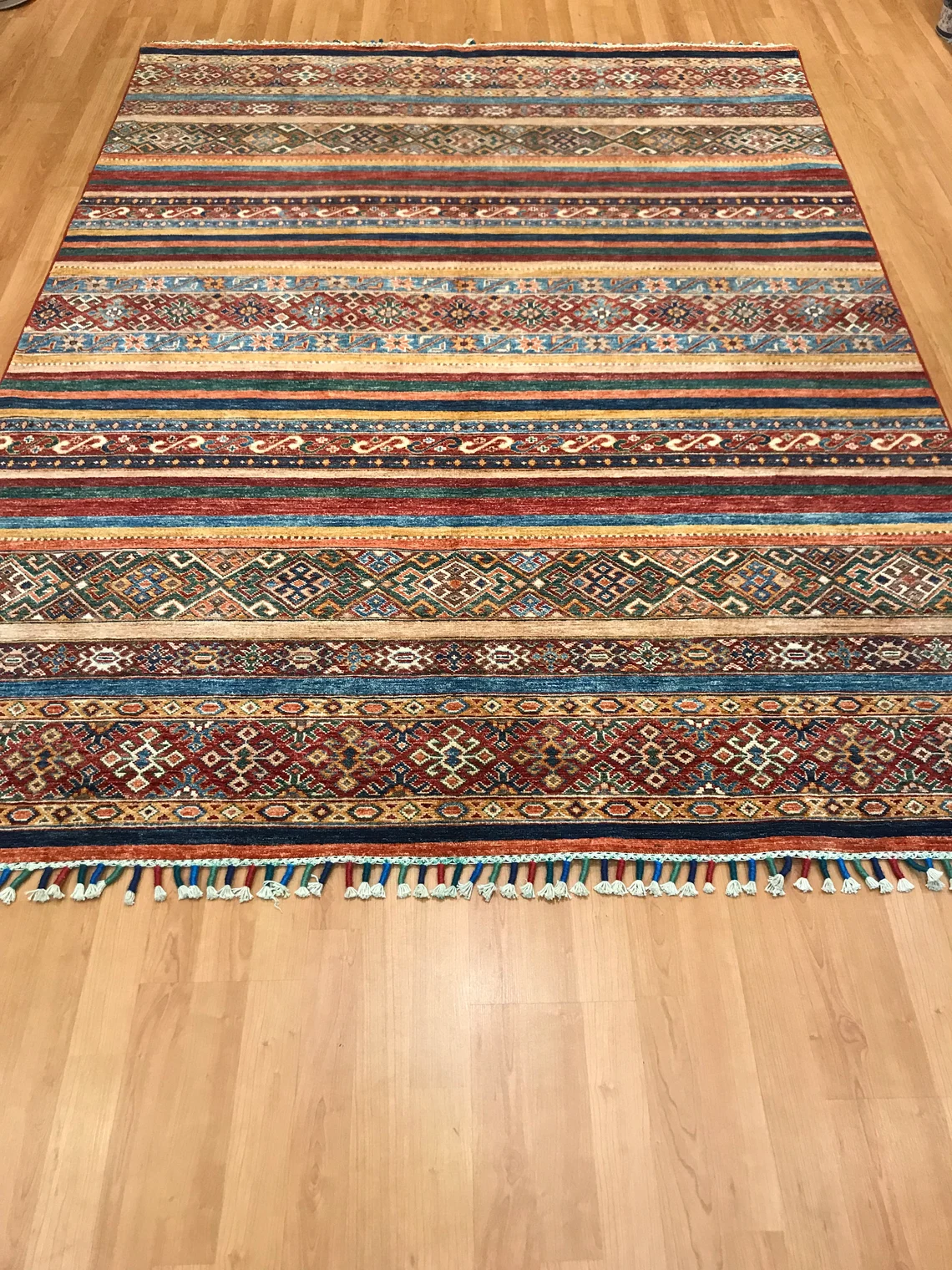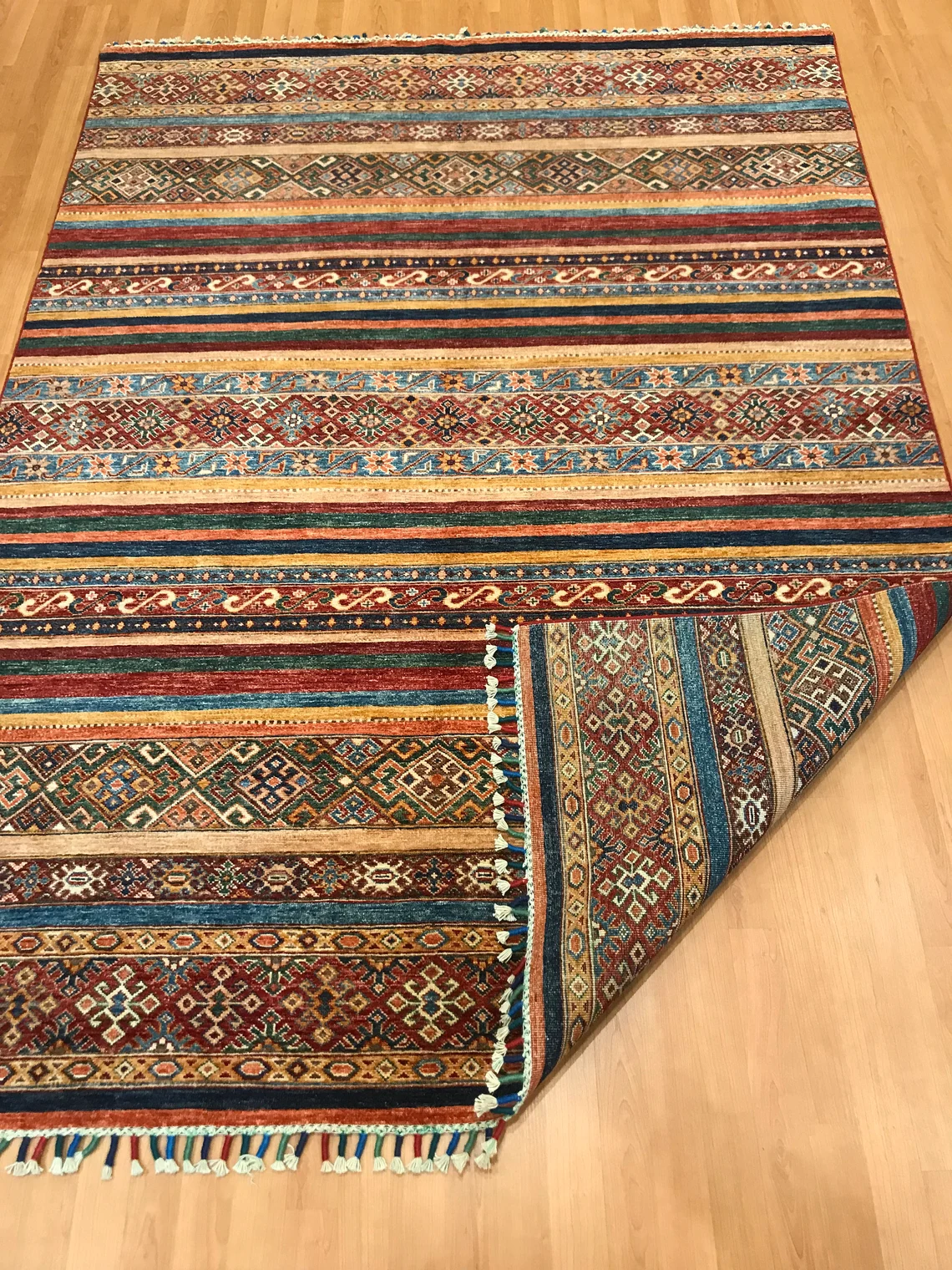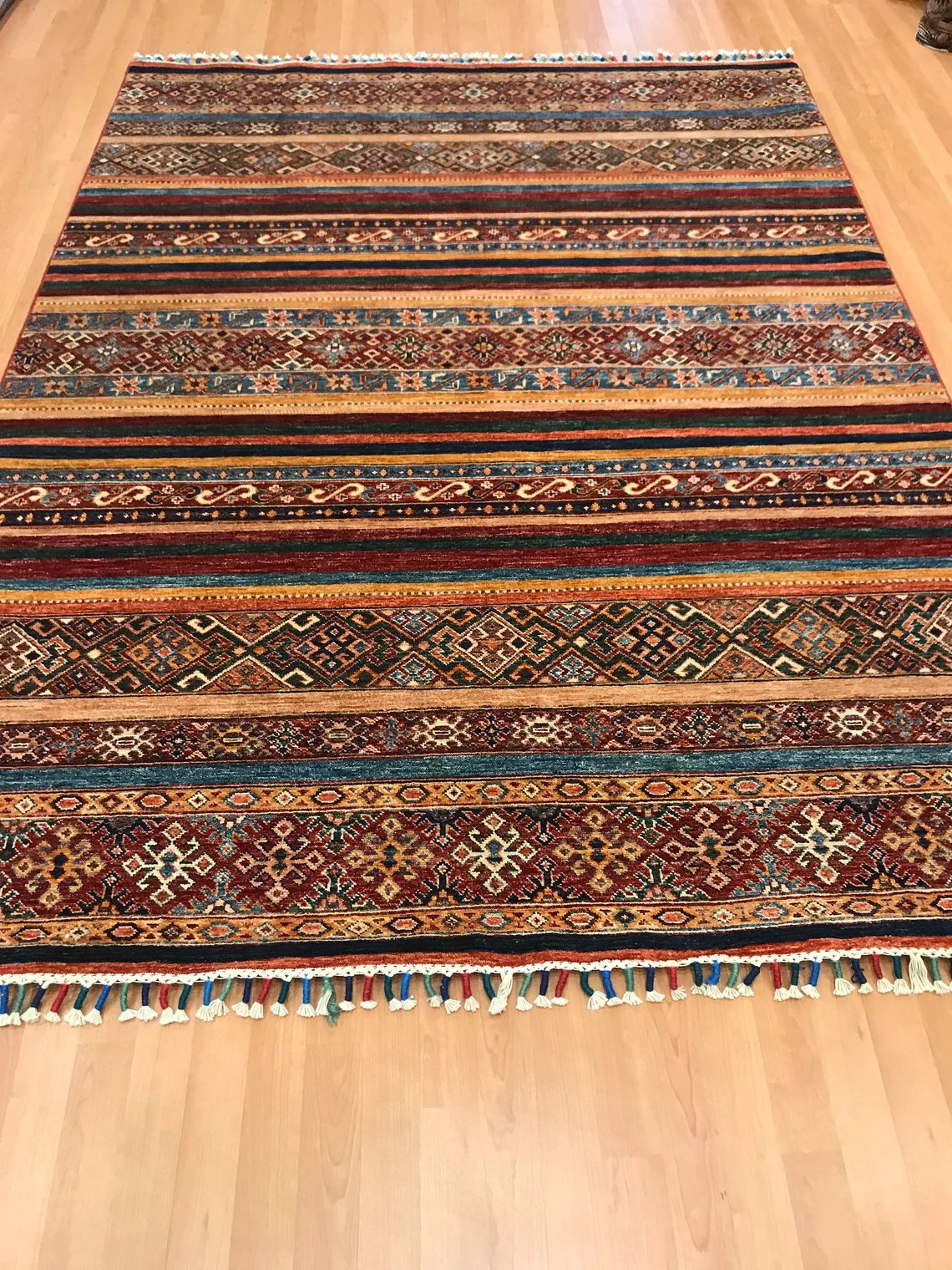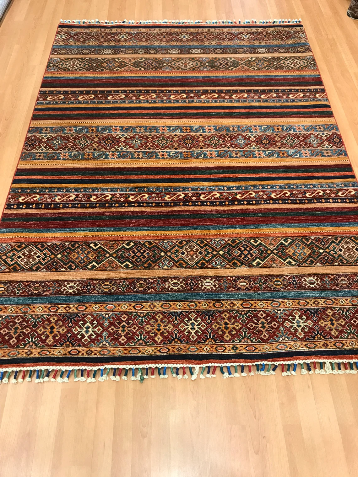 Our beatiful handmade carpet is made by wool on cotton. It is 7'8'' by 5'8'' ( 235 cm x 172 cm ) . It is double-knott and 20 years old . It will make your home shined with its beautiful color combination. It is usable with shoes .It is professionally cleaned, washed and ready to use.