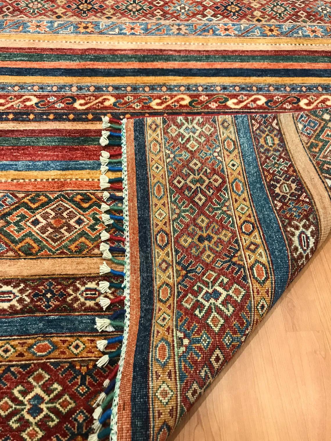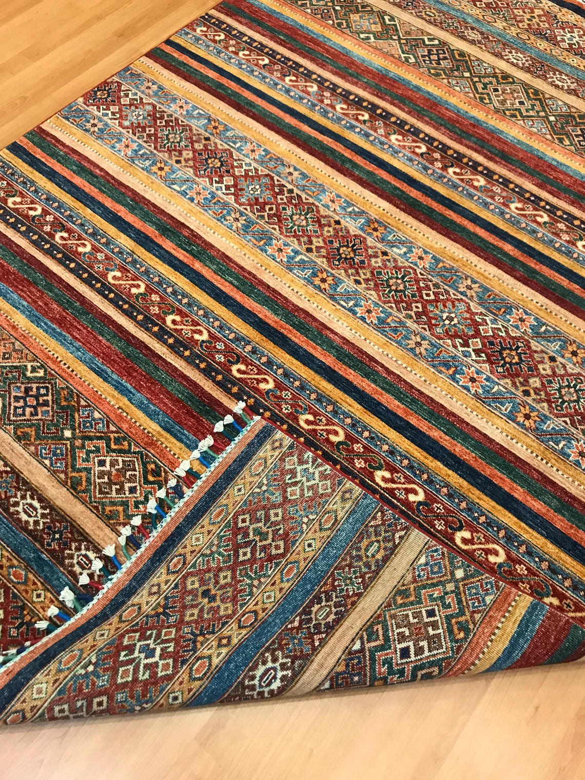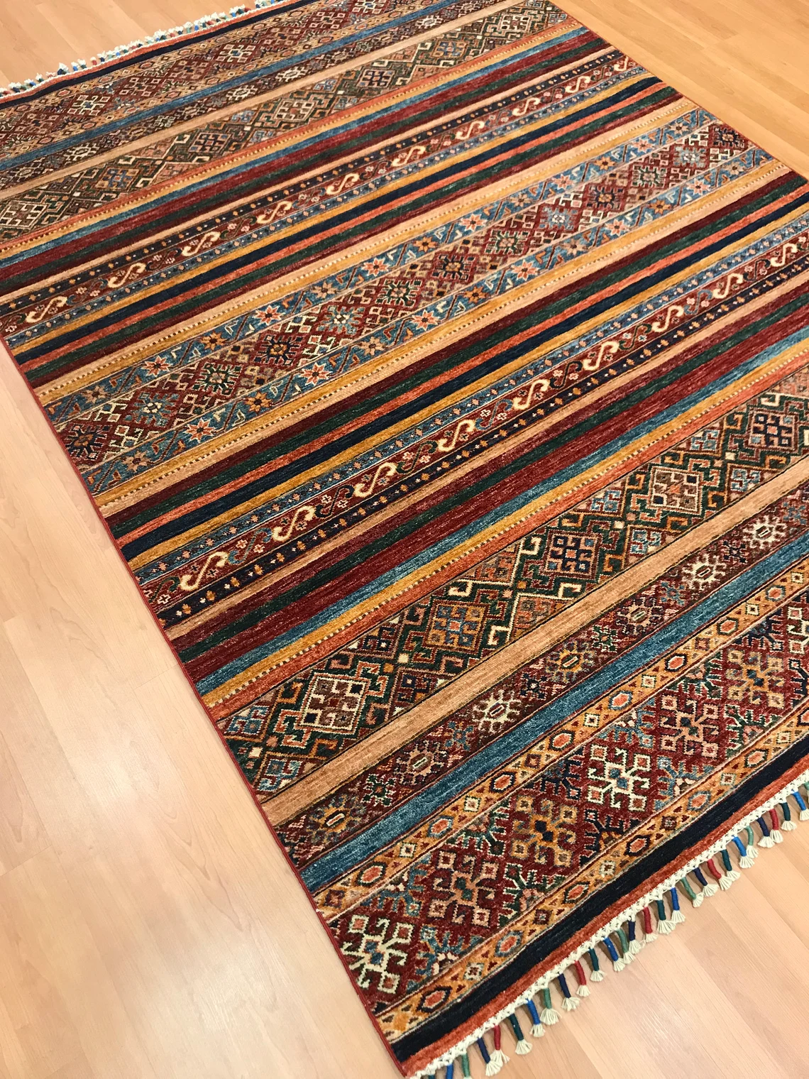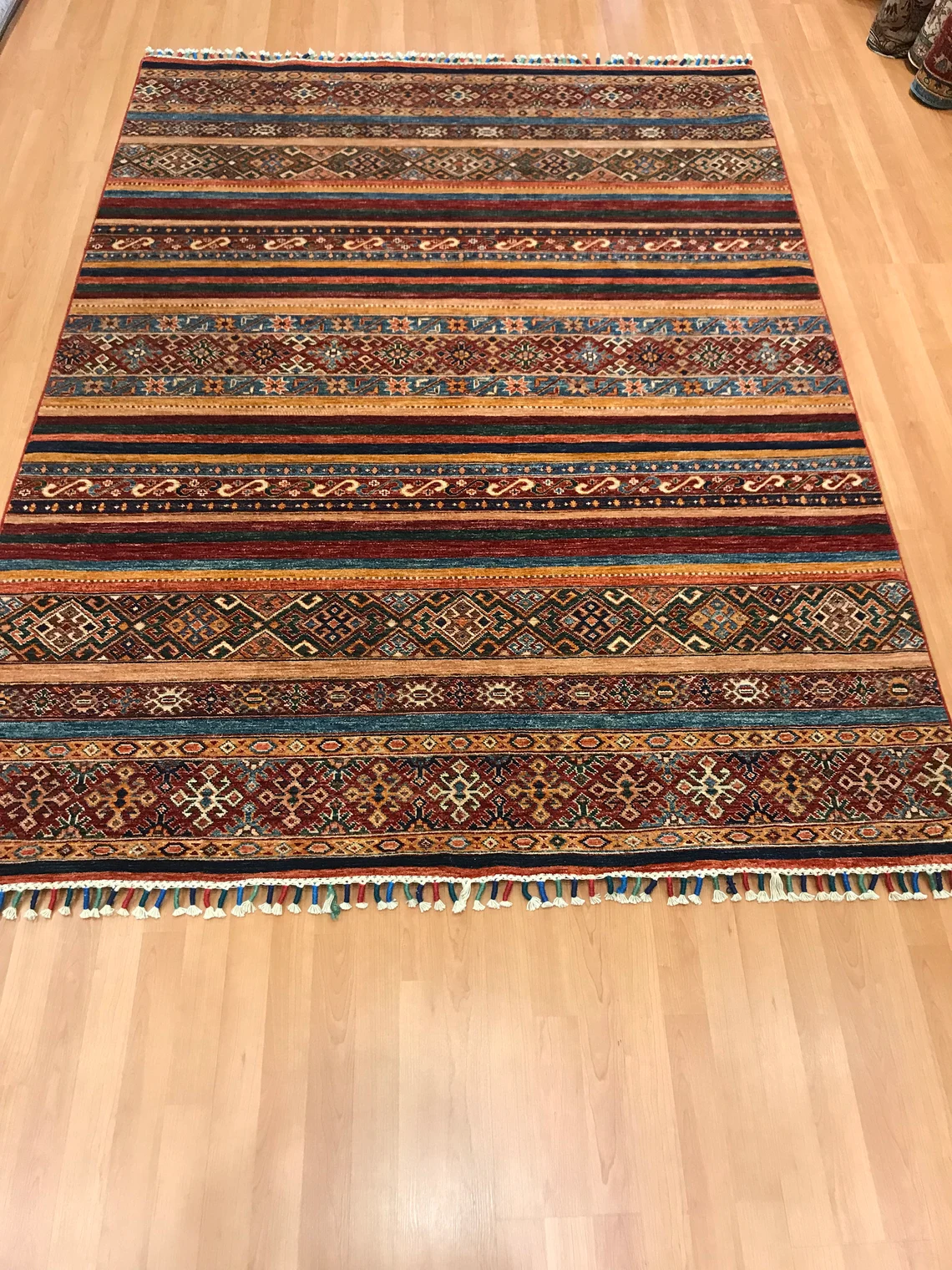 Our beatiful handmade carpet is made by wool on cotton. It is 7'8'' by 5'8'' ( 235 cm x 172 cm ) . It is double-knott and 20 years old . It will make your home shined with its beautiful color combination. It is usable with shoes .It is professionally cleaned, washed and ready to use.