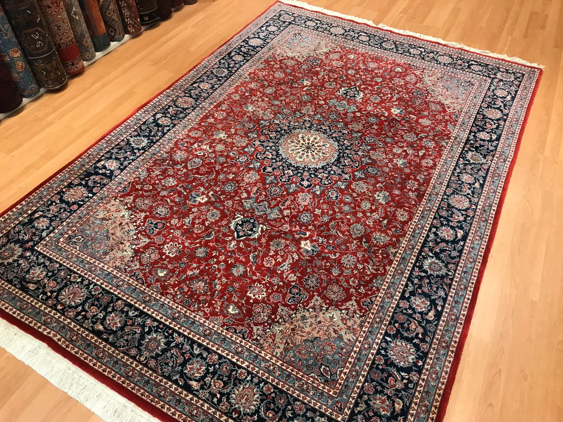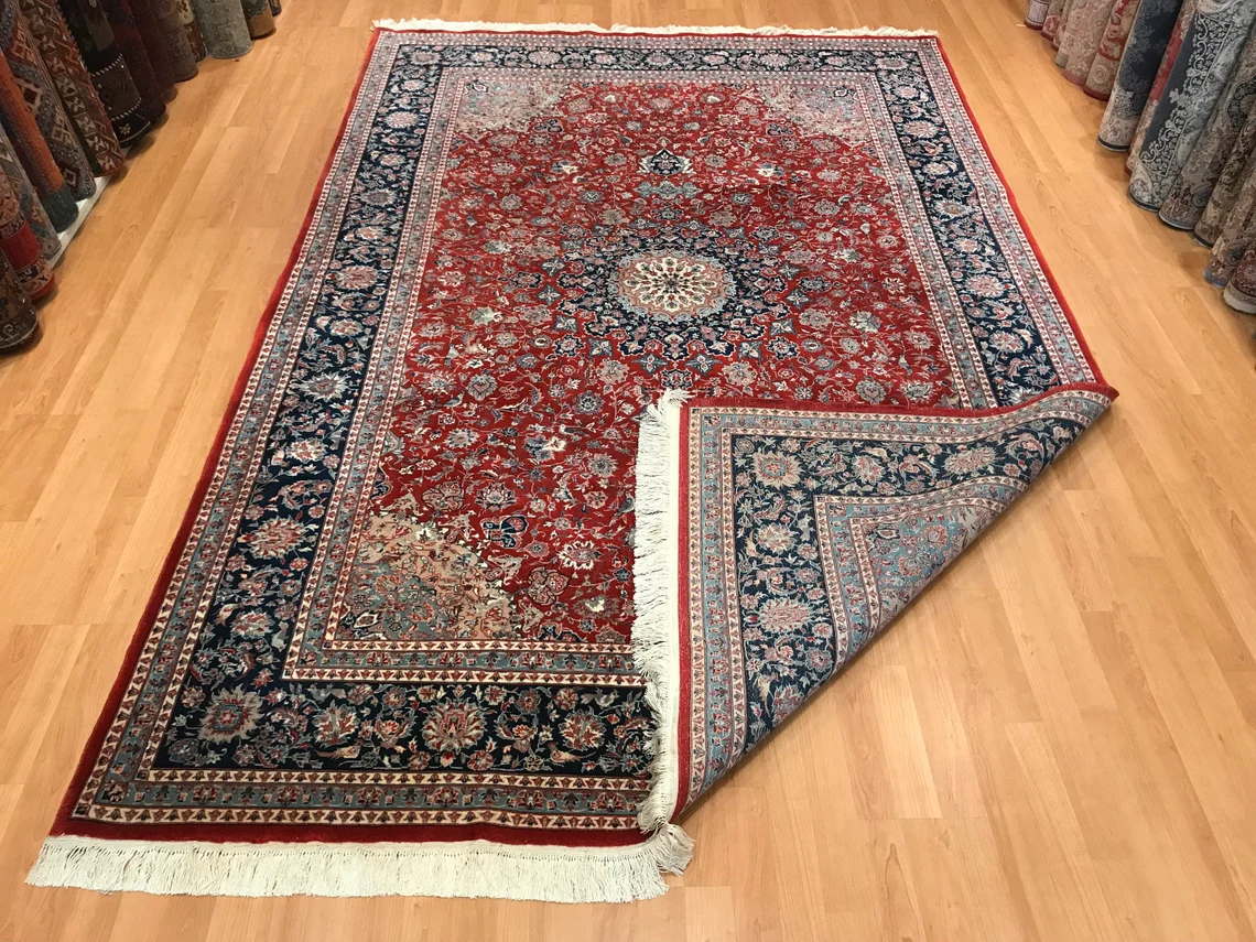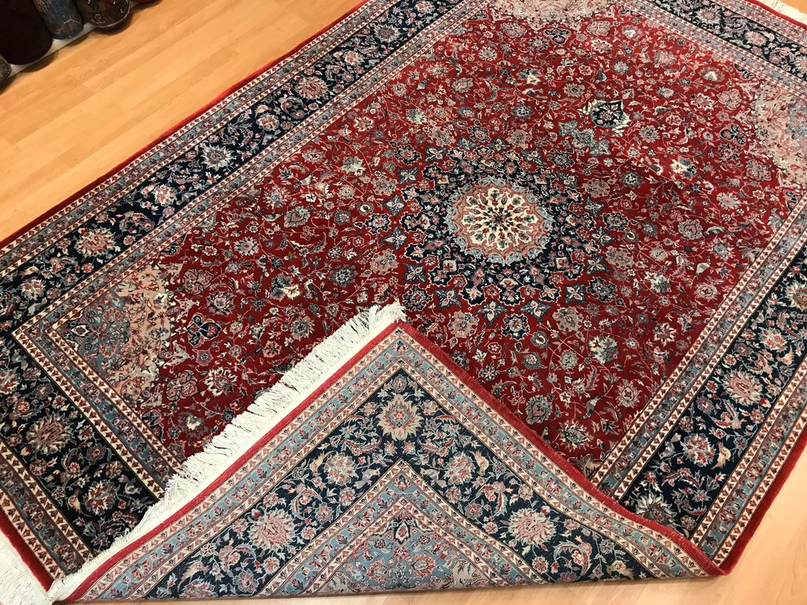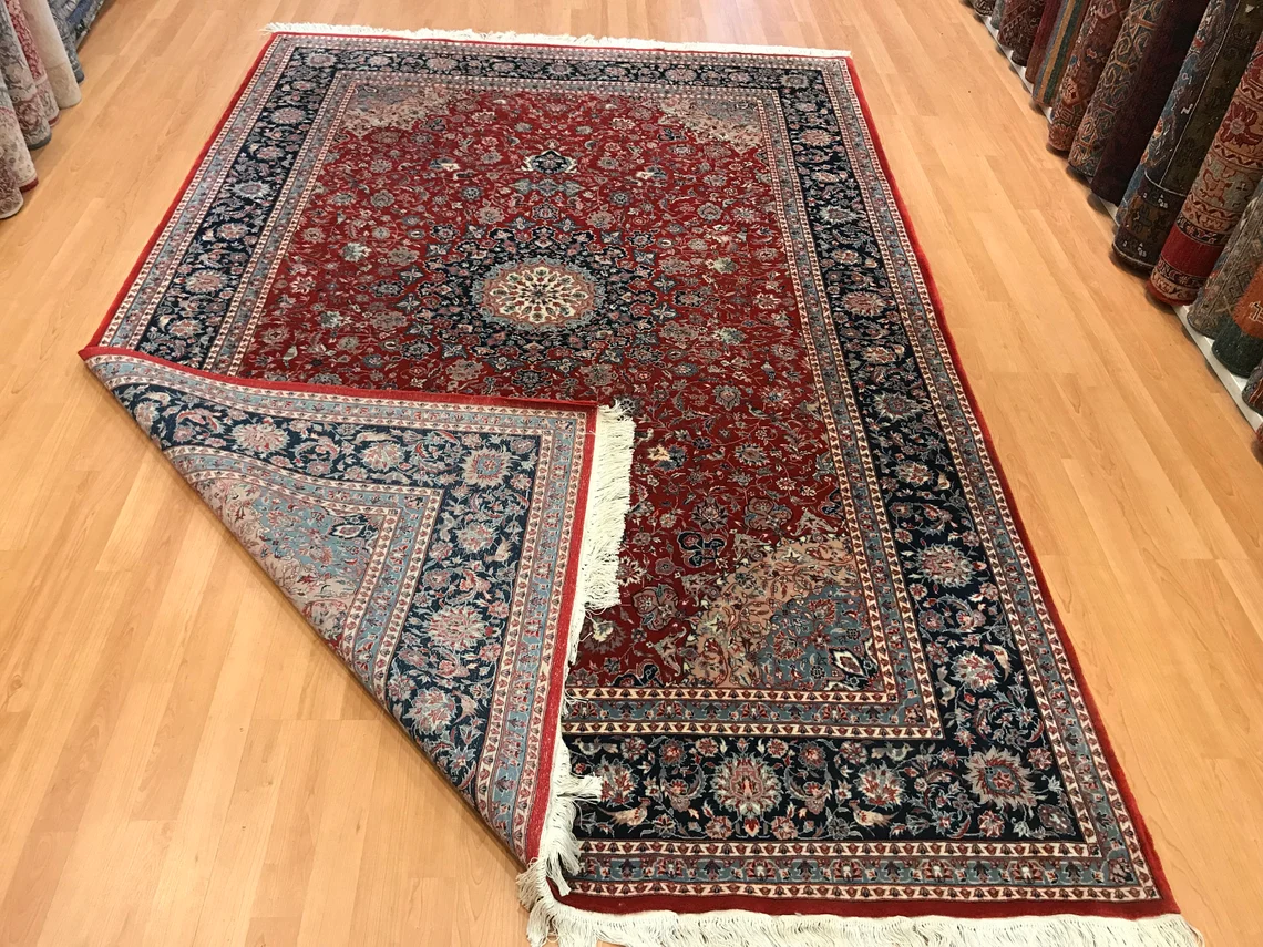Our beatiful handmade carpet is made by wool on cotton. It is 9'1'' by 6' (277 cm x 184 cm ) . It is double-knott and 20 years old . It will make your home shined with its beautiful color combination. It is usable with shoes .It is professionally cleaned, washed and ready to use.