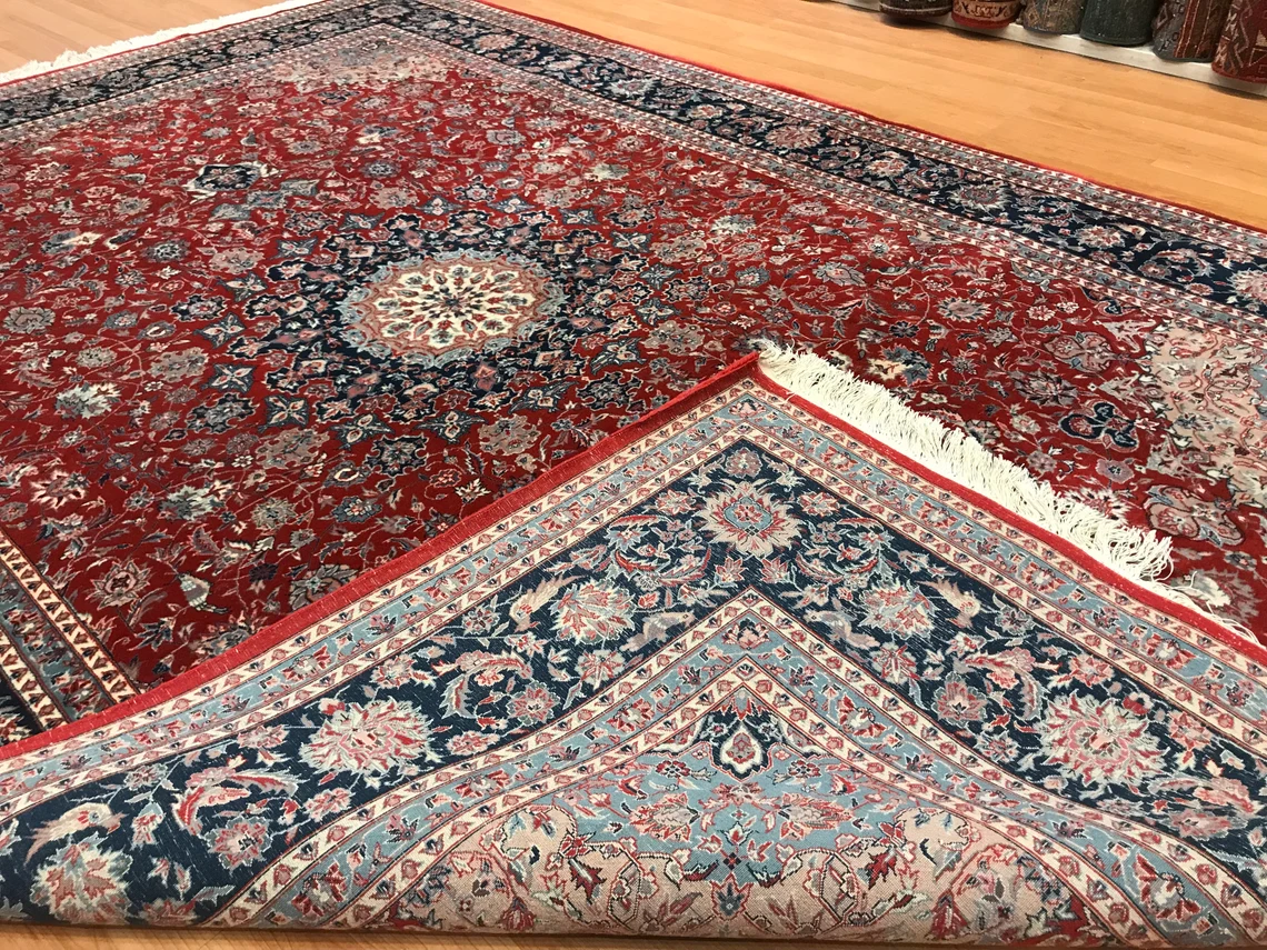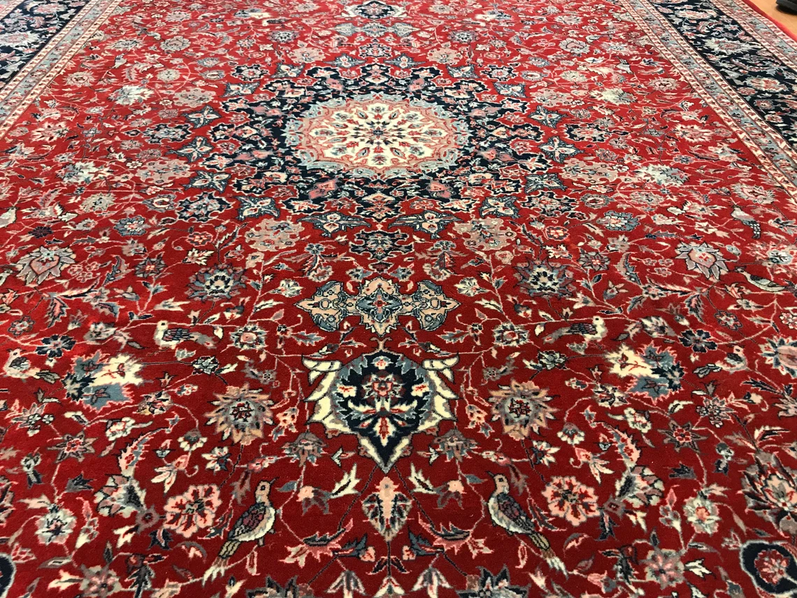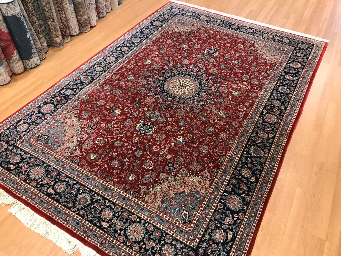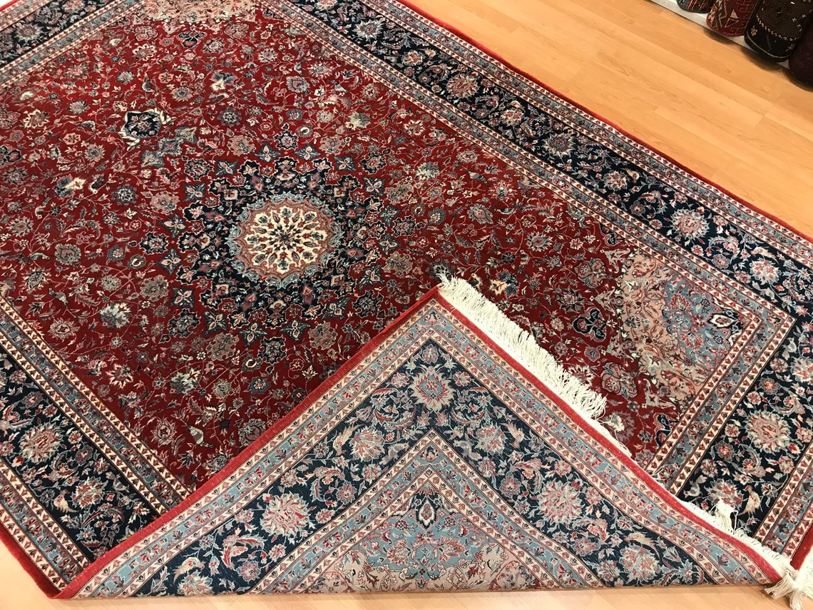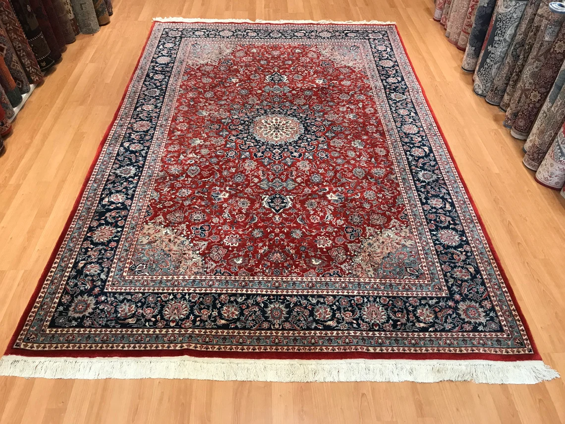 Our beatiful handmade carpet is made by wool on cotton. It is 9'1'' by 6' (277 cm x 184 cm ) . It is double-knott and 20 years old . It will make your home shined with its beautiful color combination. It is usable with shoes .It is professionally cleaned, washed and ready to use.