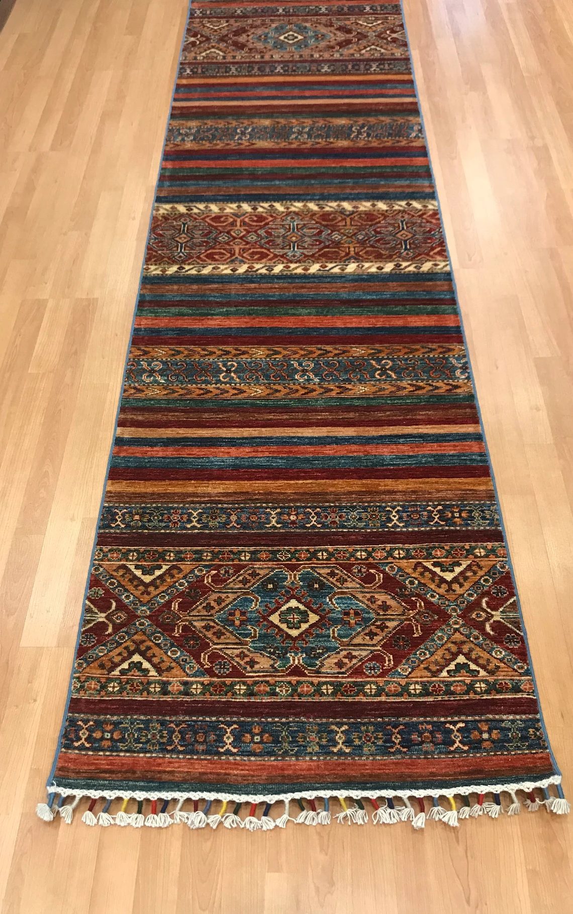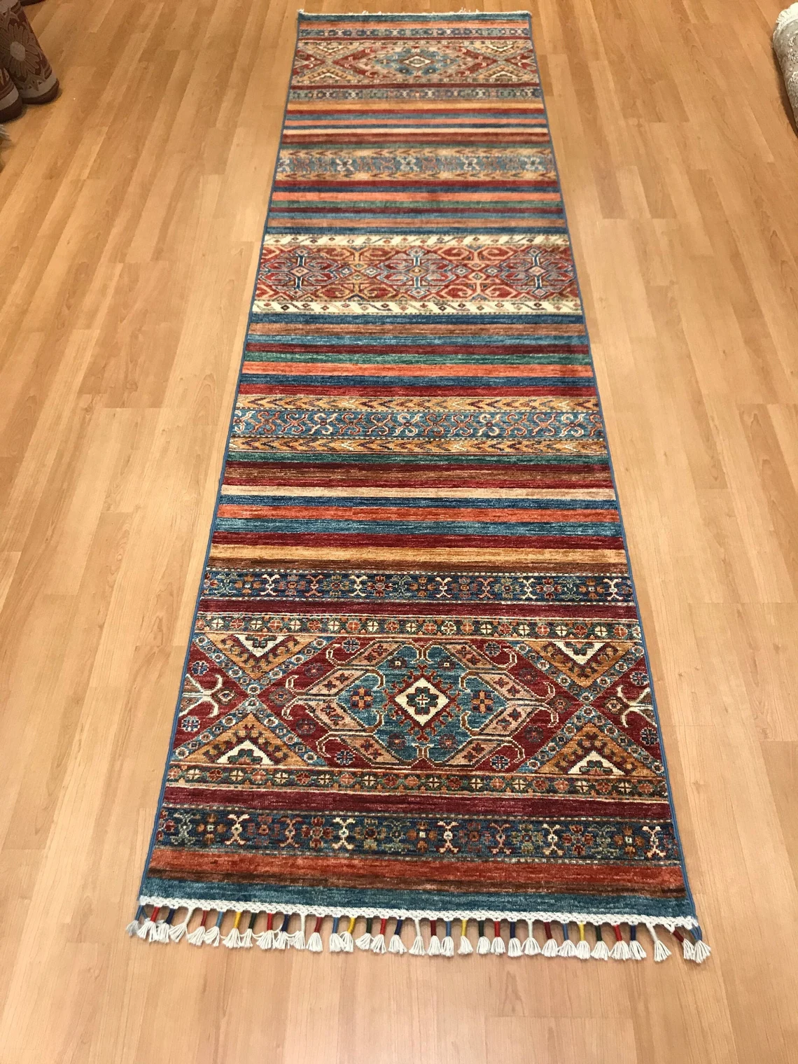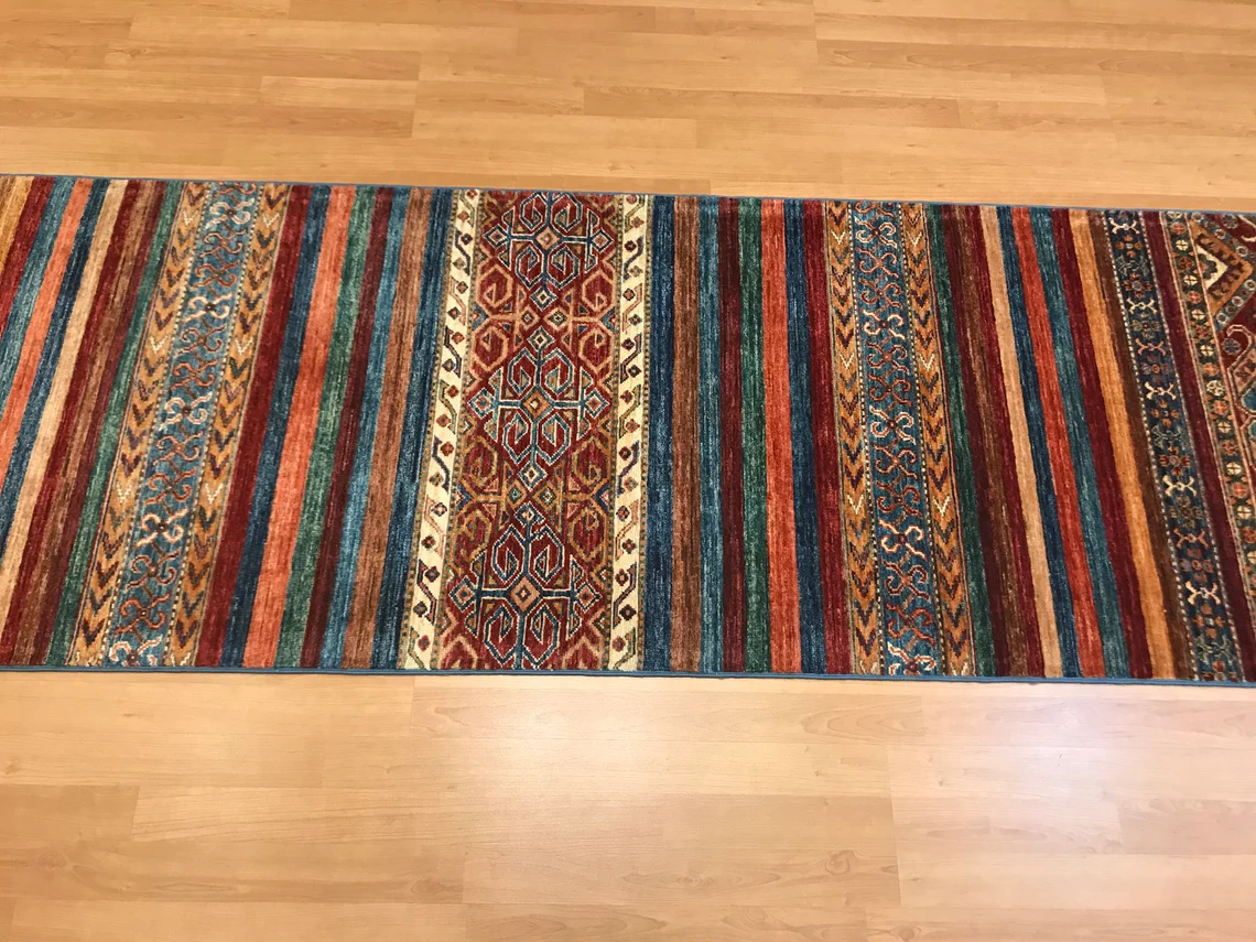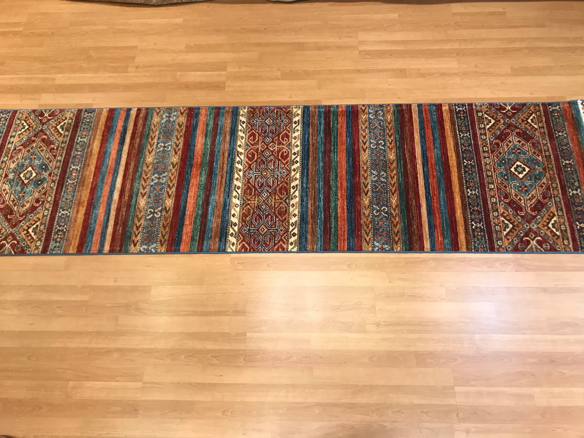 This custom-made runner is 20 years old.It is 9'10'' by 2'8'' ( 299 cm x 0.80 cm ). It is made by wool on cotton .
