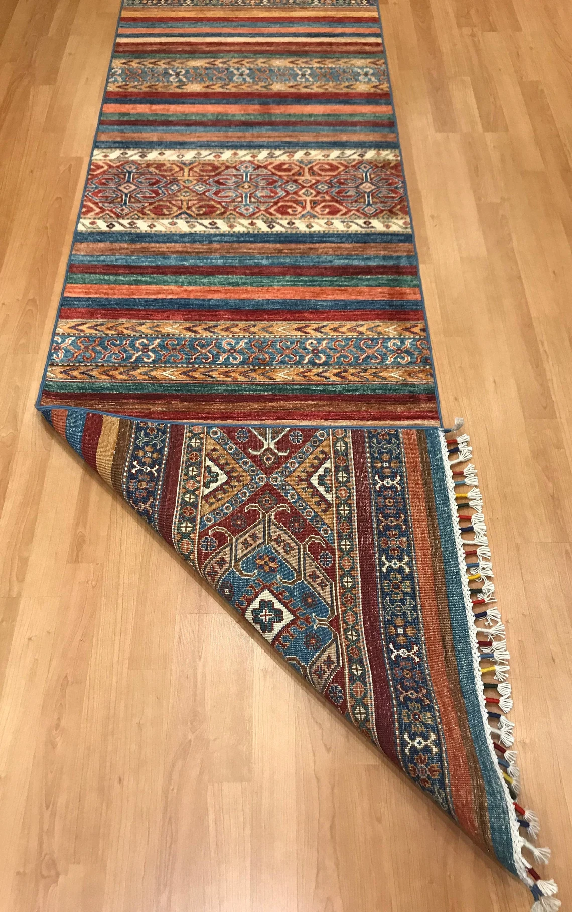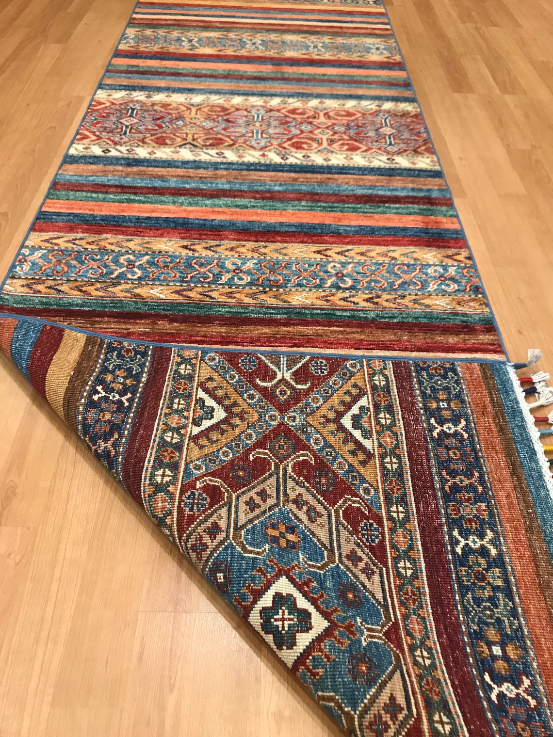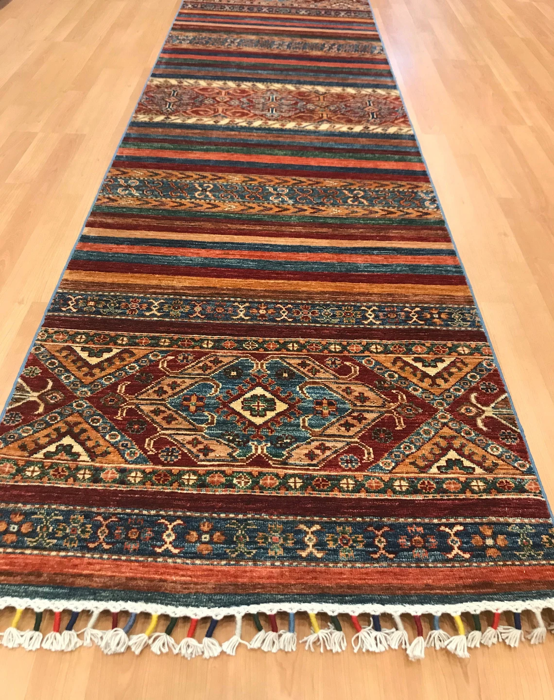 This custom-made runner is 20 years old.It is 9'10'' by 2'8'' ( 299 cm x 0.80 cm ). It is made by wool on cotton .