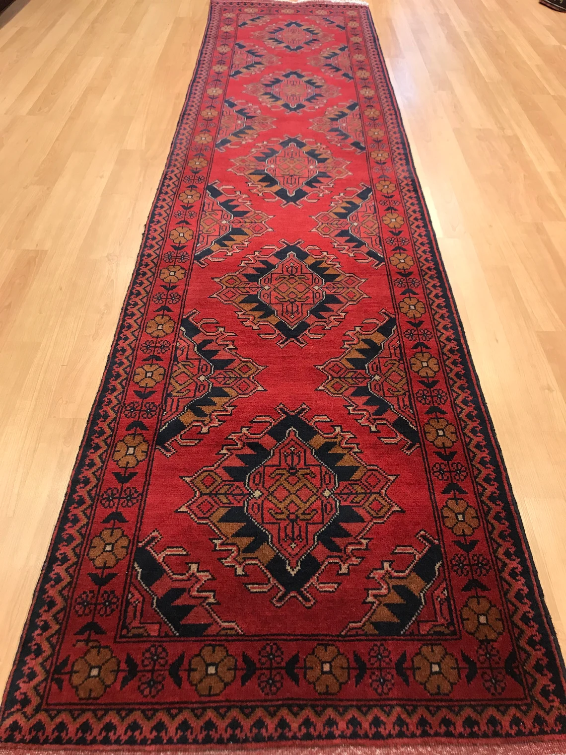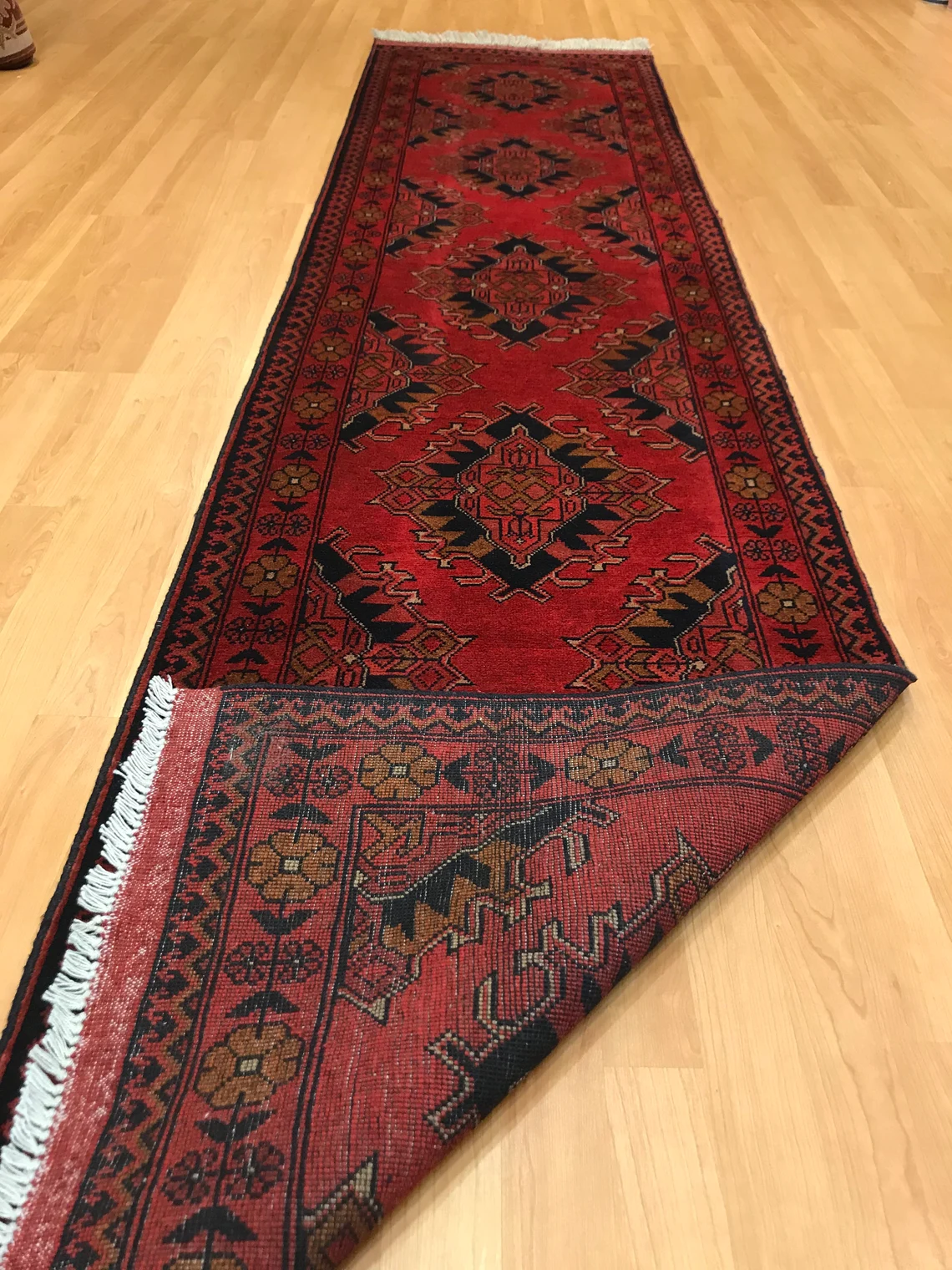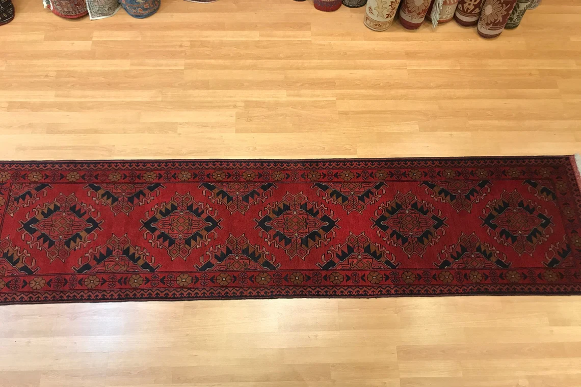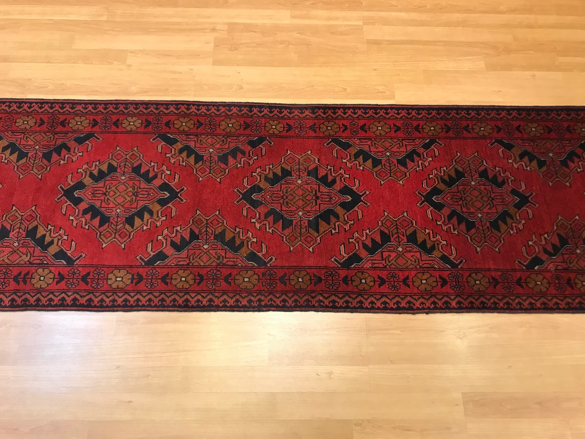 This beautiful runner is called Buhara. It is 30 years old . It is 9'5'' by 2'3'' (287 cm x 0.70 cm ) . It is made by wool on wool . It suits every part of your house .