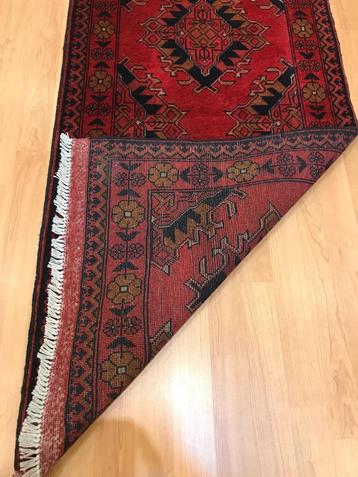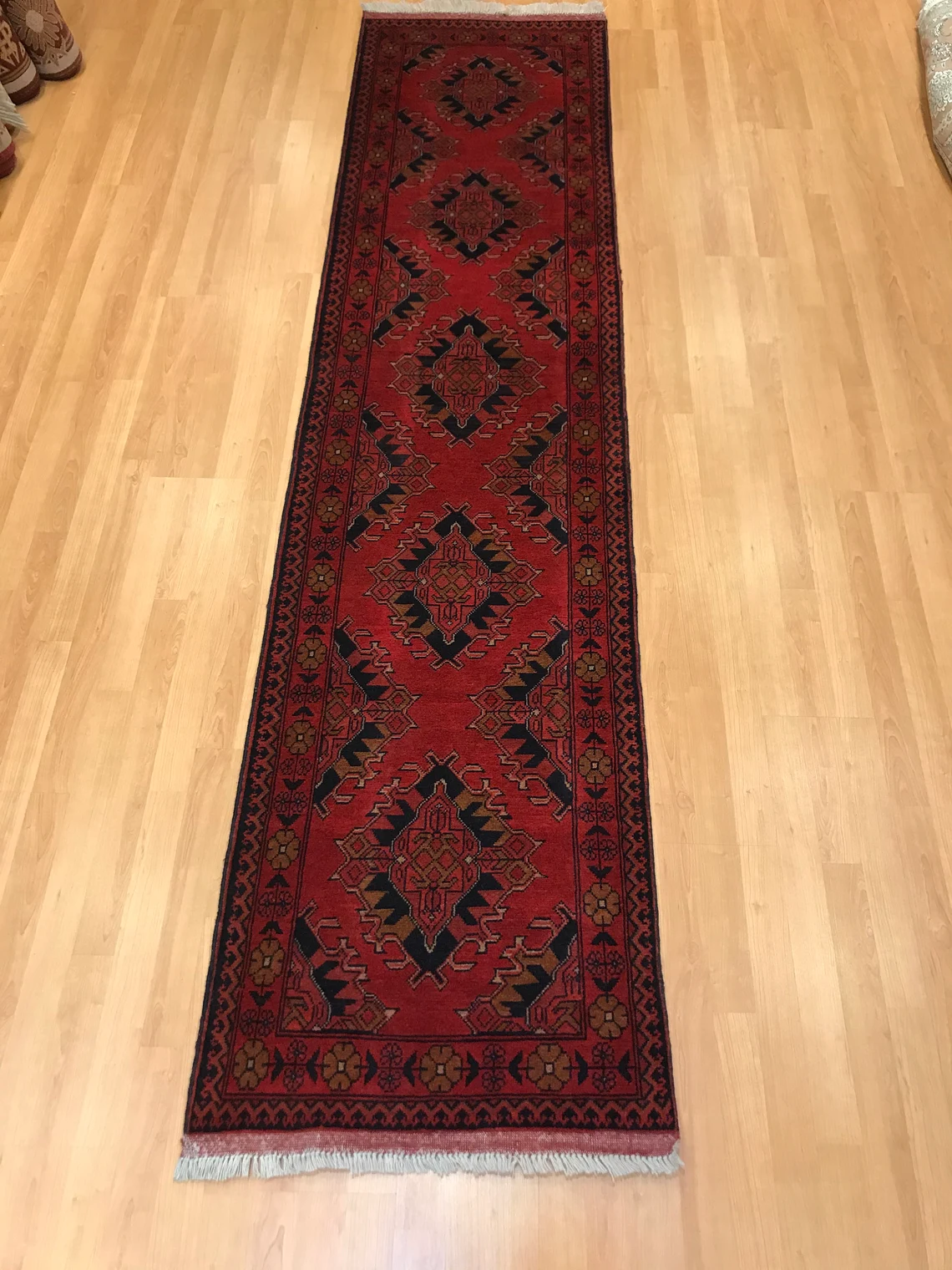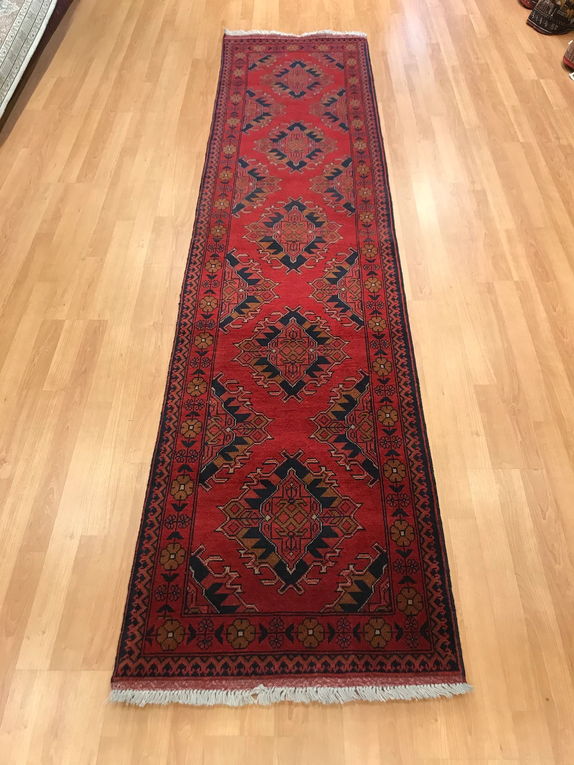 This beautiful runner is called Buhara. It is 30 years old . It is 9'5'' by 2'3'' (287 cm x 0.70 cm ) . It is made by wool on wool . It suits every part of your house .